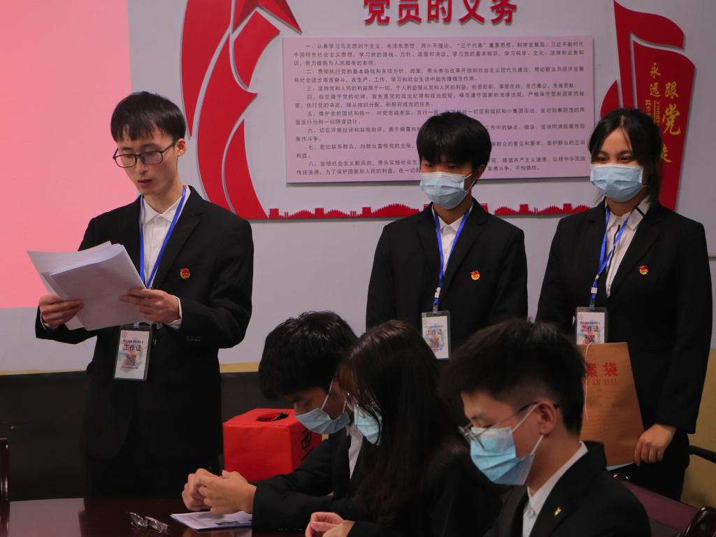 会议伊始,全体肃立齐唱国歌。崔宝玉老师作此次会议的筹备汇报,强调了预选举会议的重要意义,严格要求全体代表人员保持公平公正的态度,严格规范会议流程,积极鼓励taptap团员在今后的日子里更加出色。随后,全体代表举手表决无异议通过此次大会增补候选人名单。工作人员随即发放预选票名单,全体代表人员认真严肃地完成了此次票选,工作人员统票过程中,全体人员共同观看《中国共产党第十九届中央委员会第五次全体代表大会》,其主要强调了以习近平同志为核心的党中央不忘初心,牢记使命,领导全党人员始终砥砺前行,不断创新的使命。观看完毕,统票人员宣读此次候选人票选情况。最后,会议在慷慨激昂的团歌中宣告结束。