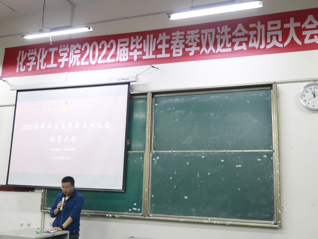 2022年4月15日上午11点,taptap点点于南坝校区一教楼111教室举办了2022届毕业生春季云上双选会动员大会,学院党总支书记朱朝菊、院长赖川、副院长向文军、各教研室主任、学工办全体老师和毕业班带班辅导员及2018级100余名毕业生出席会议,大会由学院党总支副书记潘维主持。