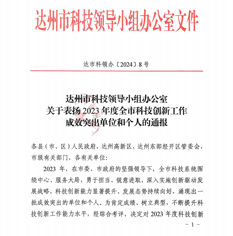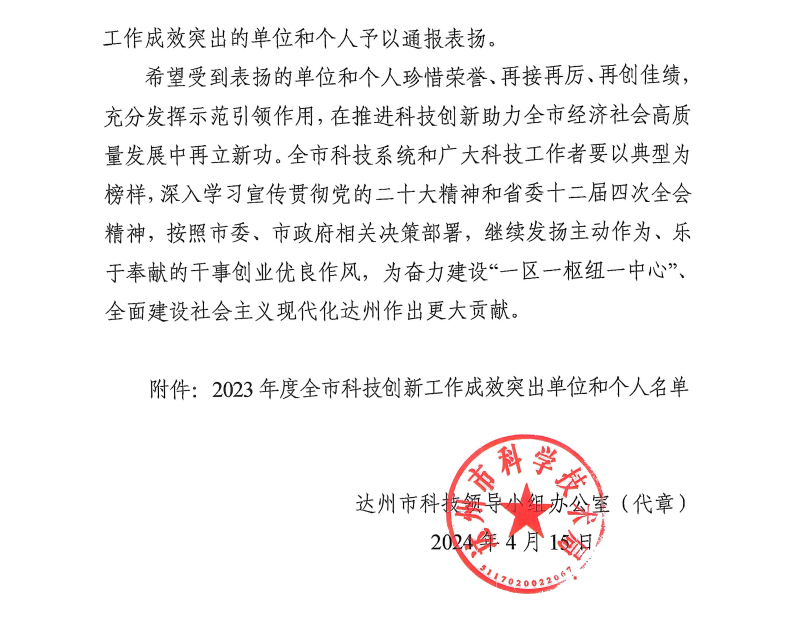 近日,达州市科技领导小组办公室下发《关于表扬2023年度全市科技创新工作成效突出单位和个人的通报》中,taptap李扬磊同志荣获“2023年度全市科技创新工作成效突出个人”称号。