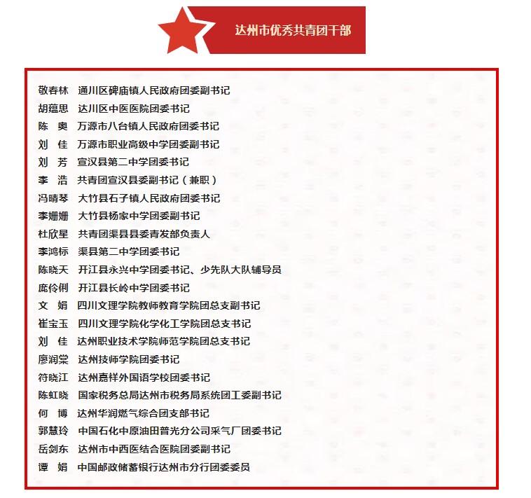 近日,共青团达州市委关于2024年达州市两红两优拟表扬对象的公示中,taptap崔宝玉同志荣获“达州市优秀共青团干部”称号。