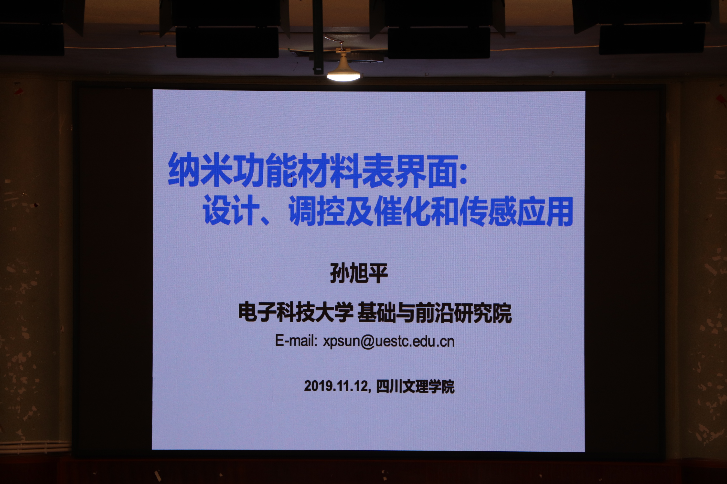 应四川文理学院taptap点点邀请,电子科技大学基础与前沿研究院孙旭平教授于2019年11月12日到访taptap点点并进行学术交流。晚上19:00孙旭平教授在南坝校区学术报告厅做了“纳米功能材料表界面:设计、调控及催化和传感应用”的专题报告。taptap点点党总支书记朱朝菊,副院长邓祥及taptap点点300余名师生代表聆听报告会。报告会由taptap点点院长刘长路主持。