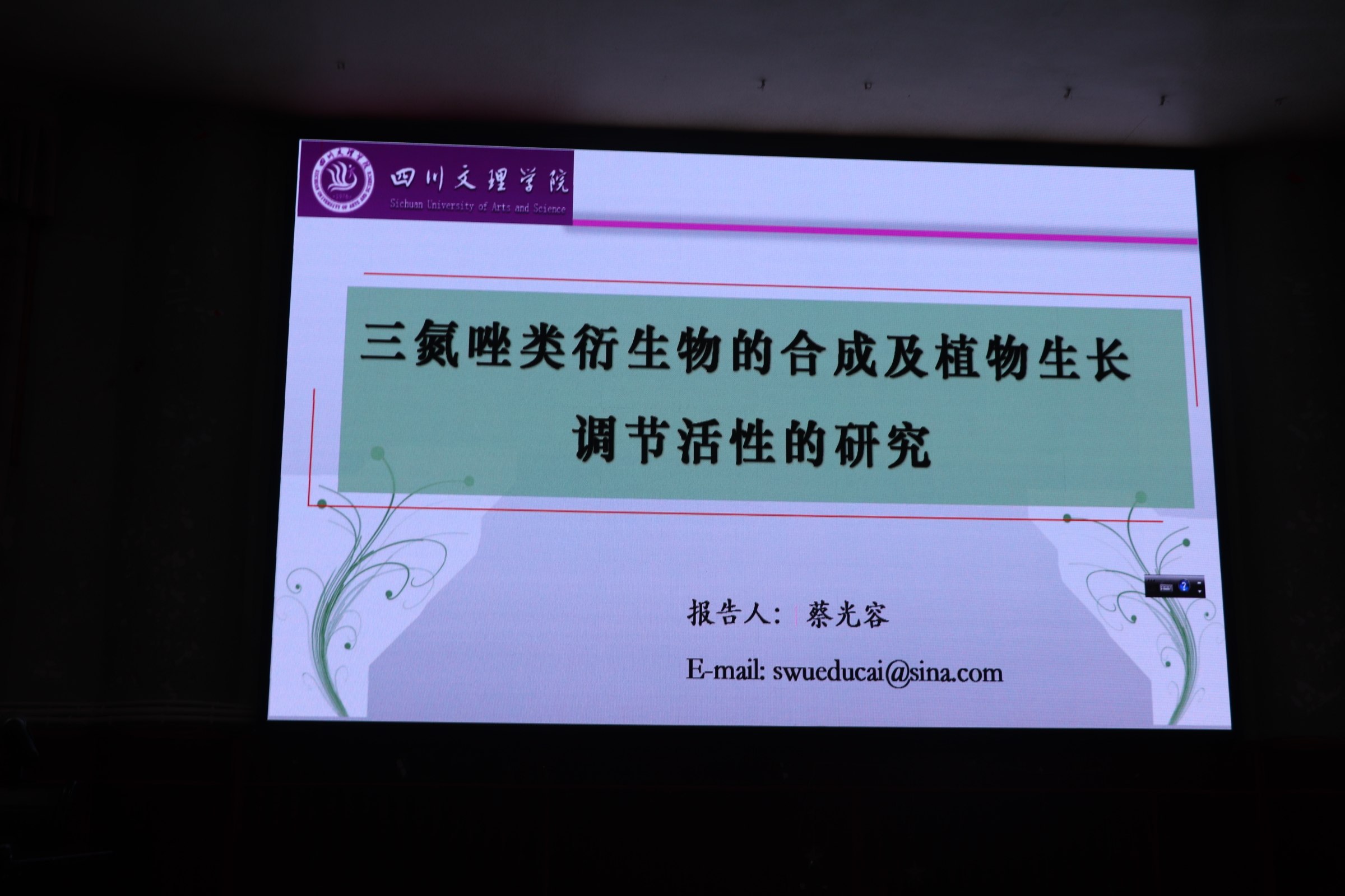 为加强师生之间的学术交流与合作,活跃学术氛围,使同学们了解关于三氮唑类衍生物的相关知识。2019年11月28日19:00,蔡光容老师在南坝校区学术报告厅作“三氮唑类衍生物的合成及植物生长调节活性的研究”主题讲座。此次讲座由蔡光容老师担任主讲,副院长赖川主持,taptap点点部分老师及大一全体学生参加。