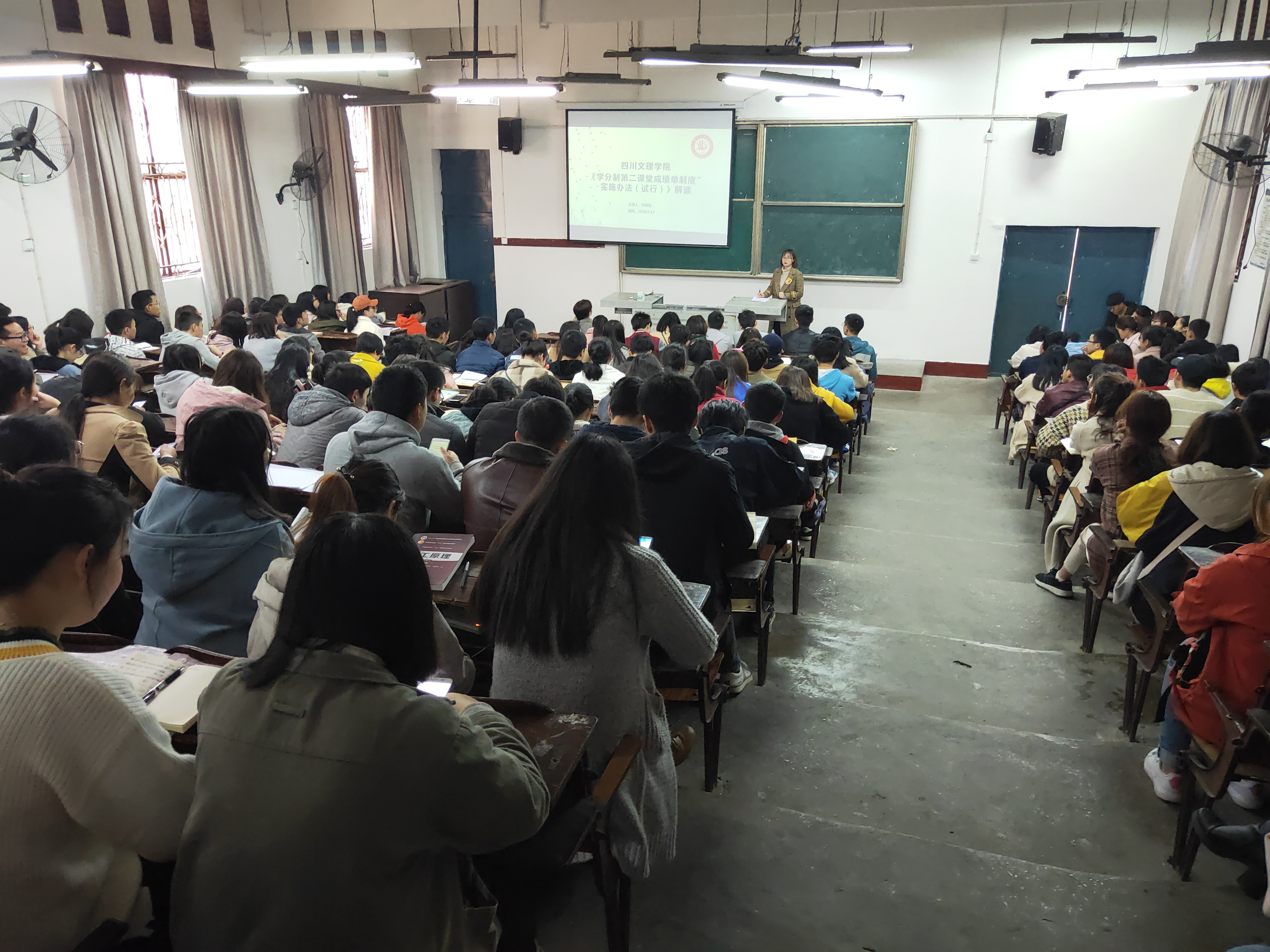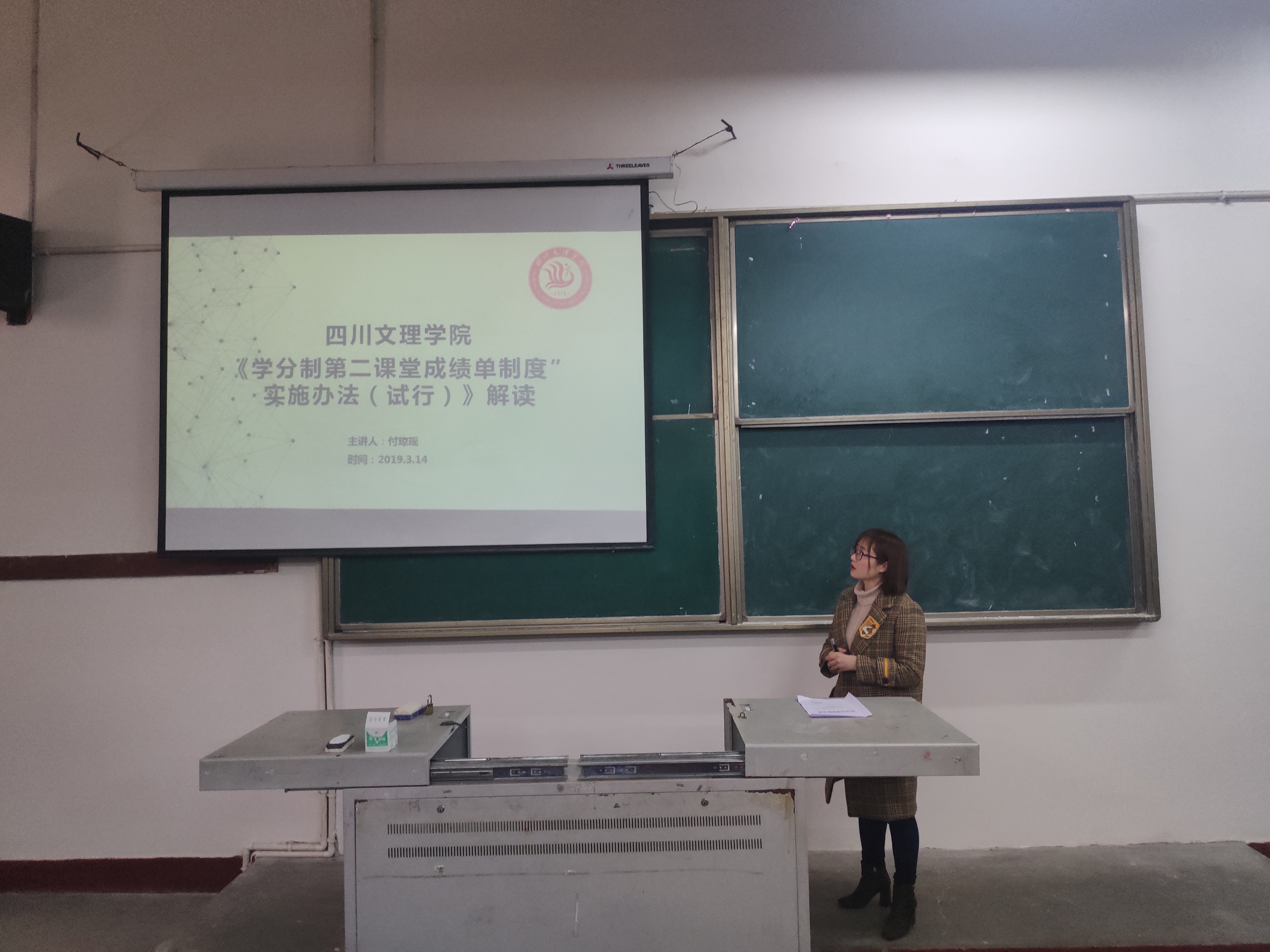 会上,付老师就“第二课堂成绩单”含义及推行原因进行了简要介绍。对“第二课堂成绩单”的内容、学分认证方法进行了全面深入的的解读,加深了同学们对“第二课堂成绩单”的理解。付老师结合学校《本科专业人才培养方案学分认定办法(试行)》的通知和《关于印发< “学分制第二课堂成绩单制度”实施办法(试行)>的通知》这两个文件为同学们详细讲解了“第二课堂成绩单”的认证方法、学分要求,并在此给出了获取学分、积分的建议。她还就PC版和手机版关于“第二课堂成绩单”的操作进行了说明。会后,仍有疑问的同学踊跃积极的进行提问,付老师耐心一一解答,并再一次强调了“第二课堂成绩单”的重要性。