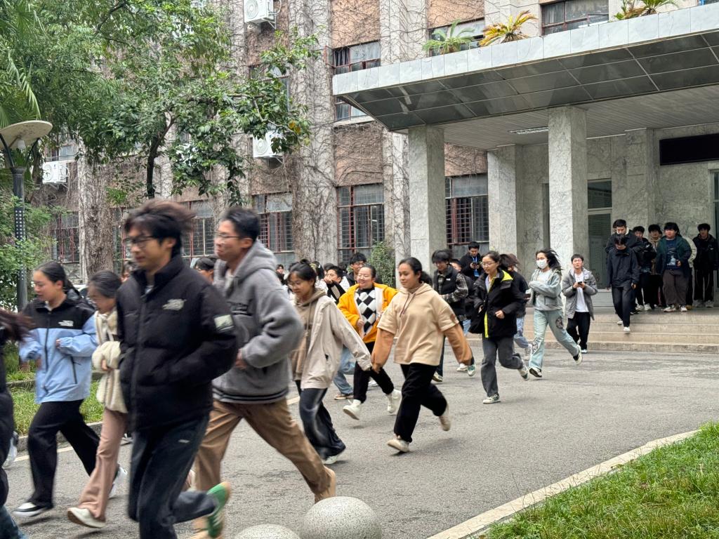 随着模拟火灾警报声的骤然响起,演练正式拉开序幕。各班班长和团支书立即组织学生按照预定的疏散路线有序撤离。各楼层负责疏散的工作人员坚守岗位,指挥师生快速疏散,避免拥挤和踩踏事故的发生。疏散过程中,师生们冷静沉着,行动迅速,仅用了3分钟就全部安全撤离到指定集合点。大一全体同学到达操场集合完毕后,各班级认真清点人数,确认全部安全撤离,并向总指挥报告疏散情况。