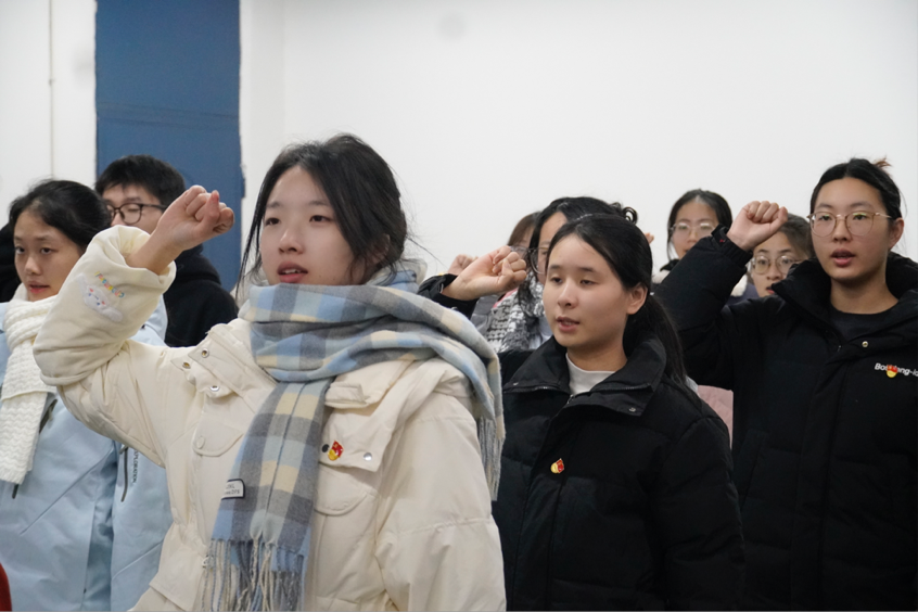 会议第三项议程,全体起立进行入党宣誓。最后,崔宝玉作总结发言,并带领支部成员深入学习了习近平总书记《论教育》的重要内容,要求全体支部成员深刻领会其核心要义,明确自身成长目标与方向,将个人发展与国家、社会需求紧密相连,增强使命感与责任感,在学习和生活中更好地发挥党员的先锋模范作用。