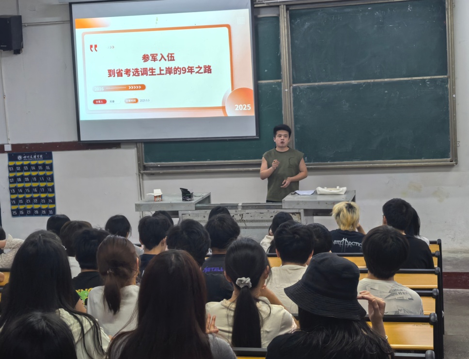 为帮助在校生明确职业规划,提升备考效率,taptap点点于5月5日在南坝校区戛云社区111教室举办了“考公、考央企经验交流分享会”。活动邀请到两位优秀毕业生——吴秦和许康,分享他们的备考历程与上岸经验。本次分享会由专职辅导员李越主持,taptap点点近两百余名学生参加本次交流会。