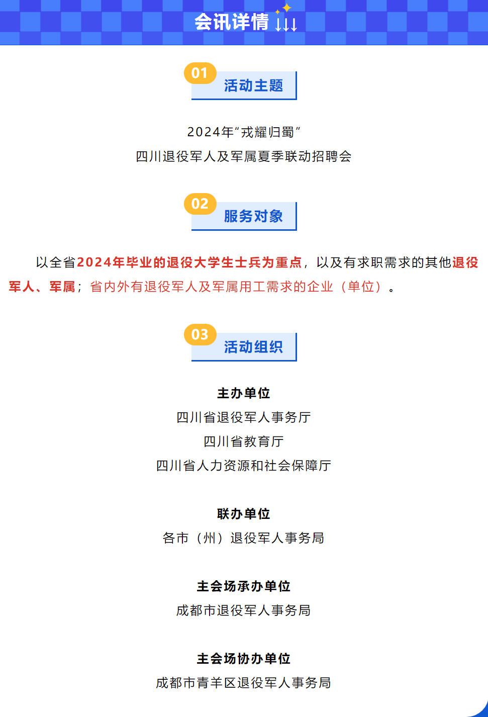 为贯彻落实习近平总书记关于促进高质量充分就业的重要讲话精神及全省高校毕业生等青年就业创业工作视频会议精神,四川省退役军人事务厅、四川省教育厅、四川省人力资源和社会保障厅将联合组织开展2024年“戎耀归蜀”四川退役军人及军属夏季联动招聘活动,畅通就业供需两端,实现精准匹配,助推退役军人及军属高质量充分就业,切实增强退役军人荣誉感、获得感、幸福感。